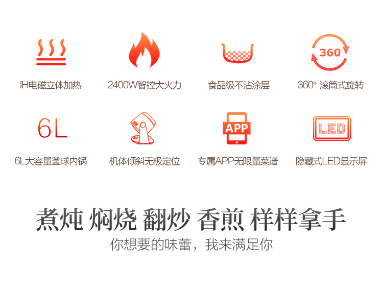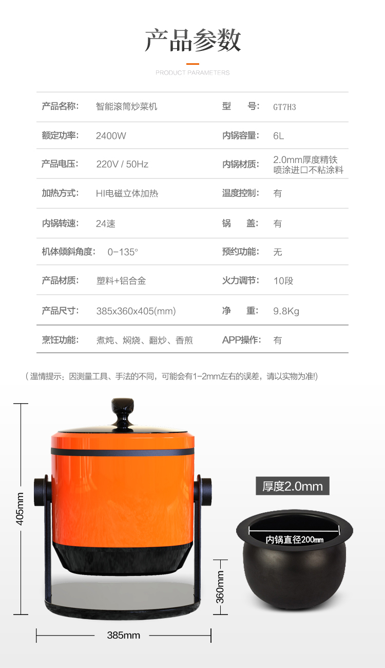 簡介:GT7H3滾筒式炒菜機,采用先進的IH電磁加熱原理,滾筒式翻炒,紅外線精準(zhǔn)控溫,230℃強勁火力、2400W大功率,燉煮、燜燒、翻炒、香煎四大烹飪功能,智能互動APP,打開手機,想做就做,讓人人吃到放心可口住家菜,享受烹飪樂趣。