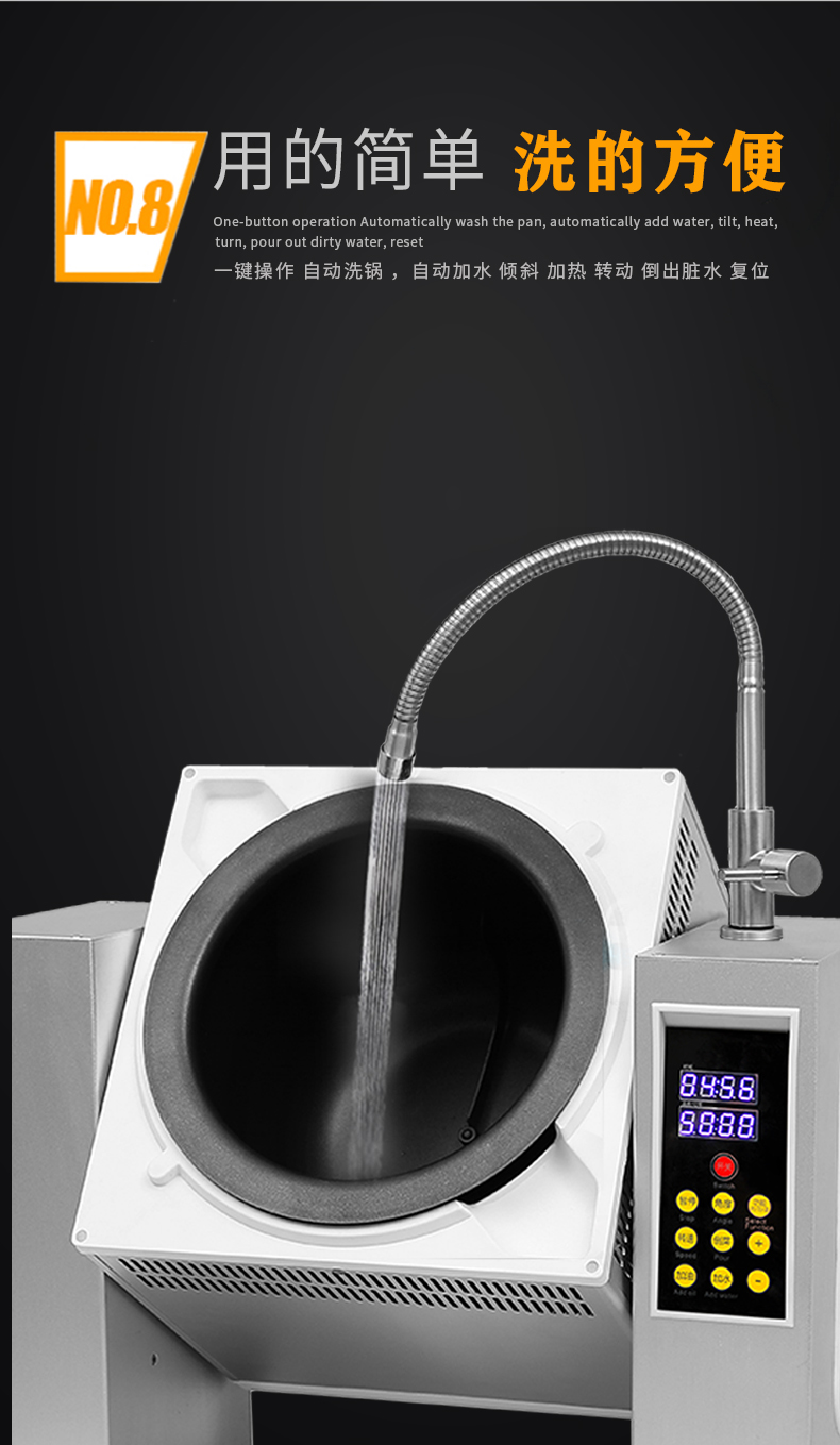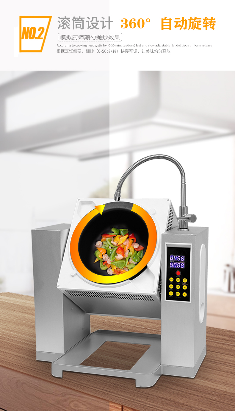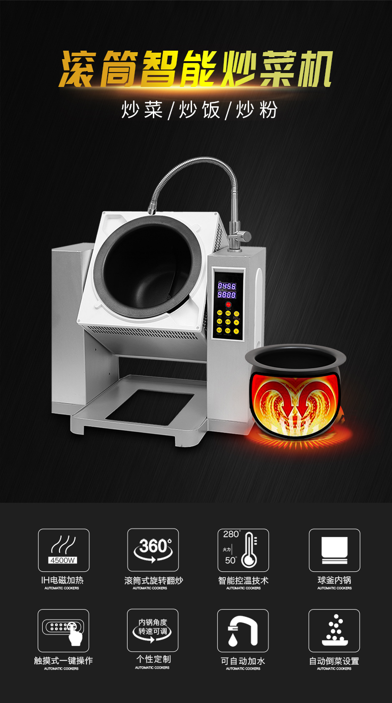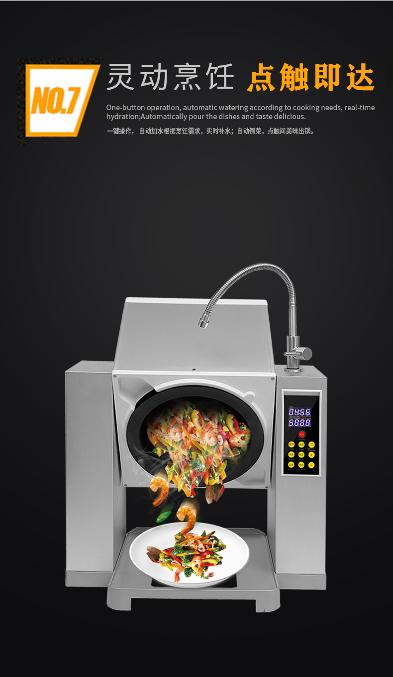 M9-50滾筒式炒菜機(jī),采用先進(jìn)的IH電磁加熱原理,滾筒式翻炒,紅外線智能控溫技術(shù),15L一次6-8份出菜量。智能化操作,自動(dòng)傾斜、自動(dòng)加水、自動(dòng)倒菜。4500W功率可調(diào),50-280℃可控溫度,0-50轉(zhuǎn)/分轉(zhuǎn)速可調(diào)??沙床恕⒊达埛勖?,炒雞、小龍蝦、麻辣香鍋等。適合連鎖加盟餐飲、中小食堂。助力打造中餐標(biāo)準(zhǔn)化和智慧餐飲。 |